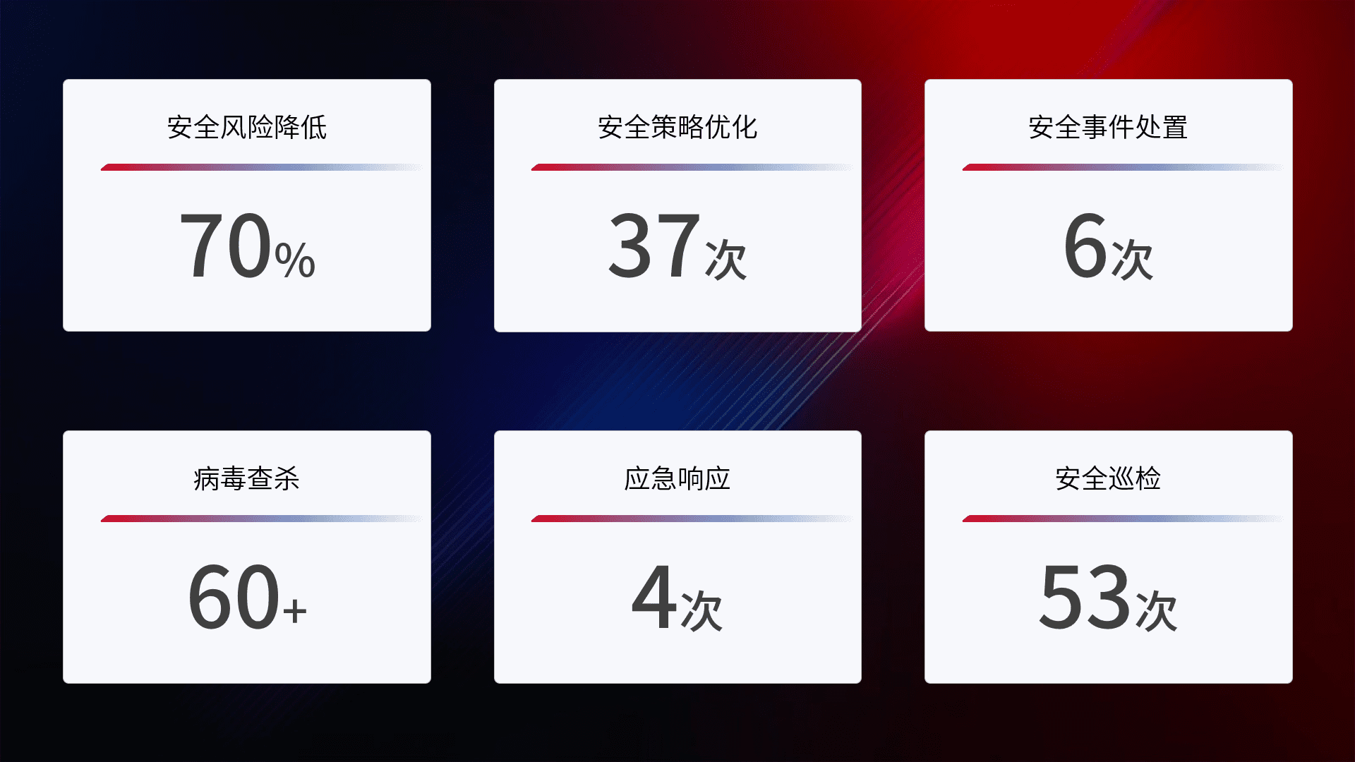 提供全面的安全事件报告体系,,,,包括处置报告、、、周报、、季度和年度总结,,,,结合持续监控,,,,帮助客户深入了解网络安全状况。。。。