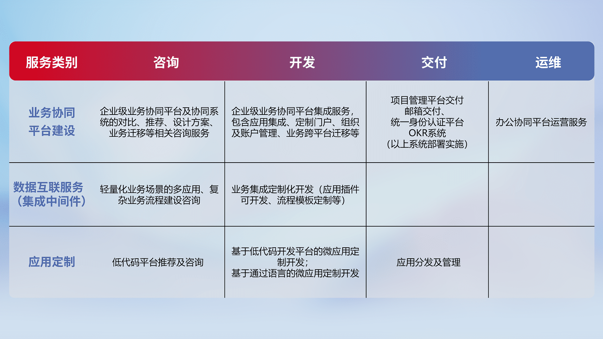 针对钉钉、、、、企微、、、、IDaas等平台级产品提供产品的规划、、、、方案、、交付、、、定制化开发等服务,,,实现如统一协同办公、、、智能客户服务、、、、混合会议管理、、、智能数据查询、、等业务场景,,,实现数字化转型。。。。